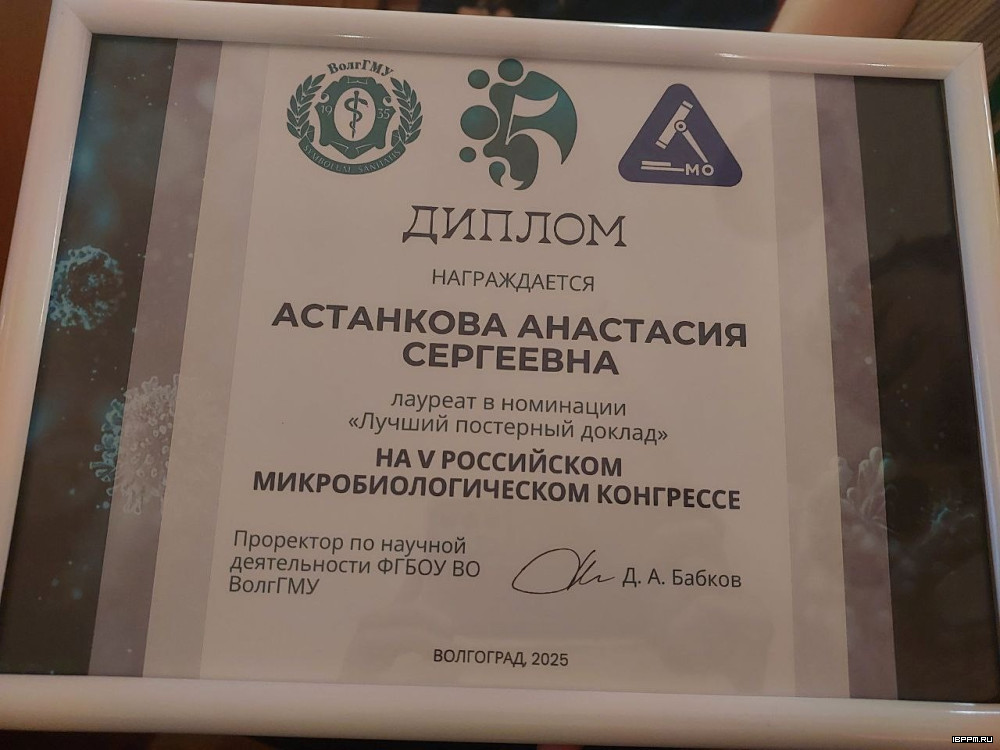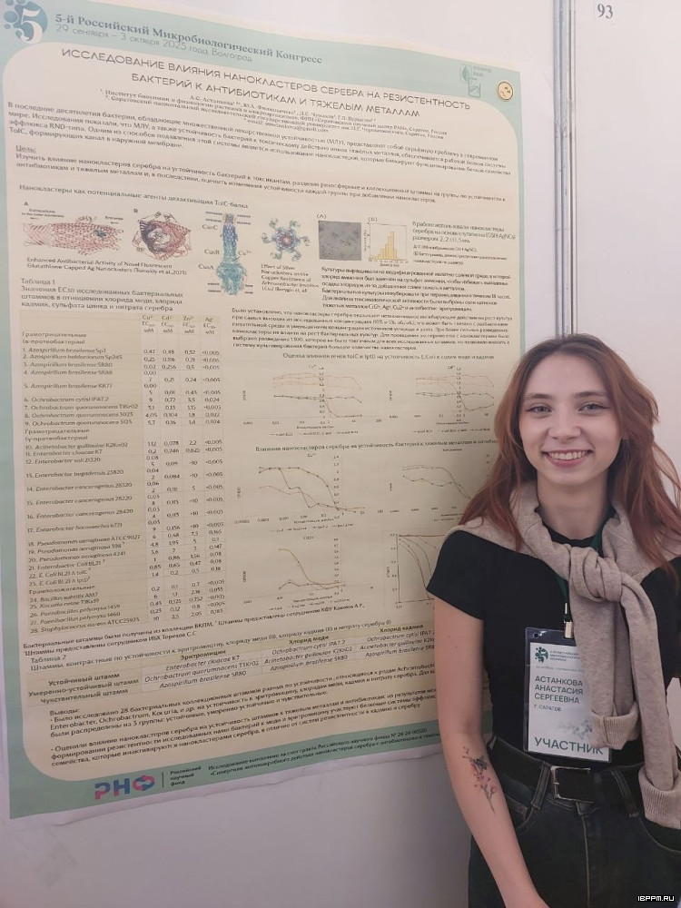 Были представлены устные и стендовые доклады, вызвавшие неподдельный интерес участников. Особо следует отметить большое внимание к пионерской работе д.х.н., проф. С.Ю. Щеголева с соавт. «Микробная энзимология in silico в изучении оксидоредуктазных систем азоспирилл». Большого успеха добились и наши молодые ученые: Астанкова Анастасия (инженер лаборатории иммунохимии) награждена Дипломом лауреата в номинации «Лучший постерный доклад» за сообщение «Исследование влияния нанокластеров серебра на резистентность бактерий к антибиотикам и тяжёлым металлам» в соавторстве с Филипьечевой Ю.А., Чумаковым Д.С. и Бурыгиным Г.Л. Работа поддержана грантом РНФ № 24-24-00520.